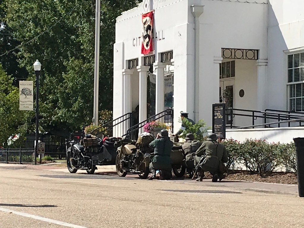 You can’t really see them in this picture, but the “American” soldiers off to the left while the “Germans” are firing at them from the porch of the City Hall. And yes, those are motorcycles with sidecars.