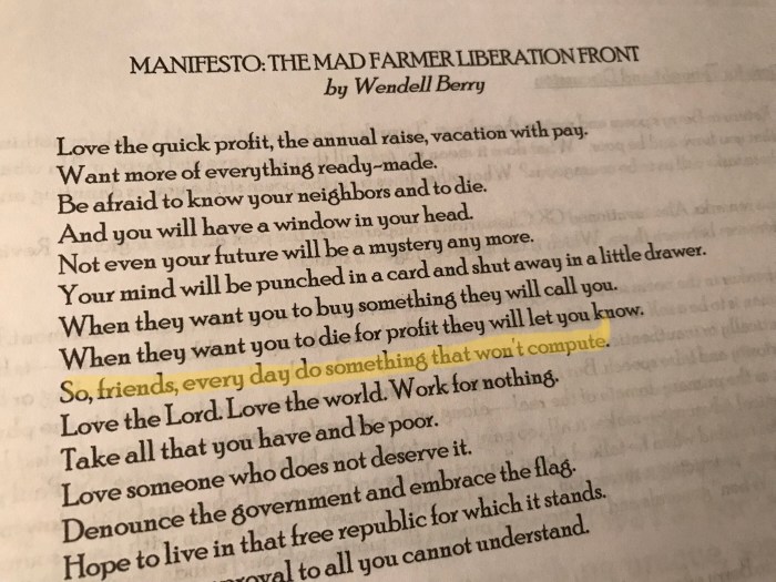 Wendell Berry’s defiance of our modern restlessness and insanity is always a breath of fresh air. I’m not sure where he stands spiritually, but his insights are marvelous–and this particular poem offers wise instructions for those who, even if the whole world is telling them to move, know it is their duty to plant themselves like a tree and say, “No, you move.β