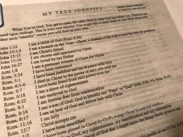 As we’ve grown up, my parents have given all of us kids a copy of this reference sheet from Bill and Annabel Gillham’s ministry. When I’m assailed by thoughts of despair and self-loathing, I know I can always go back to these Scripture references. They remind me of who I truly am in Christ, and show me how those horrible thoughts of mine don’t reflect the way God feels about me at all! (You can find part of this list here, at the Gillhams’ son’s blog.) Β Β