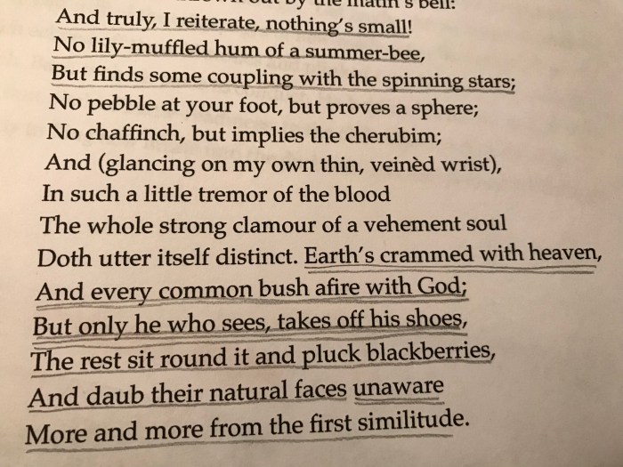 As I delve deeper into the idea of the sacramental life–the idea that every area of life is a sacred gift of God and under Christ’s Lordship–I find myself with an intense awareness of the beauty God Himself infused into this world. Elizabeth Barrett Browning’s poem Aurora LeighΒ contains this remarkable section about how, if we quiet our souls enough, we are equipped to perceive all the ways in which God reflects His glory and His design in the entiretyΒ of His creation.