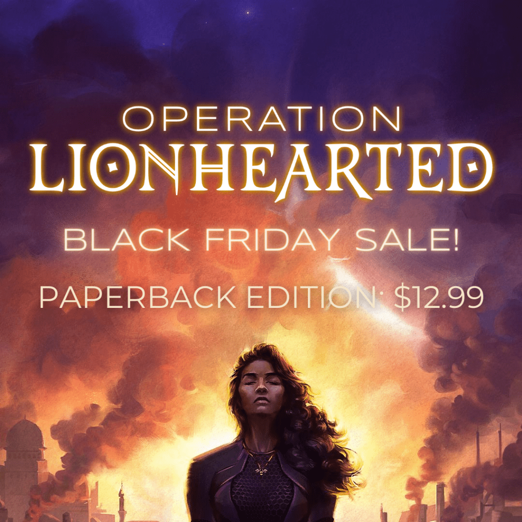 Hey-hey, friends! I’m just popping in here really quick to let everyone know about my first Black Friday sale! From now till the end of Cyber Monday, the paperback edition of Operation Lionhearted is on sale for $12.99! That’s about a 20% off discount; the usual price is $15.99.