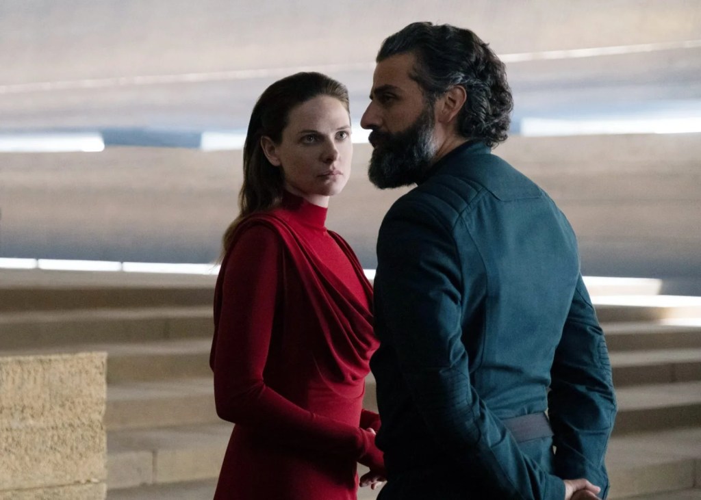 Lady Jessica, Paul’s mother, is played with steely dignity by Rebecca Ferguson. Stellan Skarsgaard plays the cruel, conniving Baron Harkonnen, who’s orchestrated the failure of House Atreides on the desert planet of Arrakis. Oscar Isaac is Paul’s father, the tragic Duke Leto. (Yes, I did snicker when Leto told Paul he always wanted to be a pilot. The Poe Dameron vibes were strong.). Zendaya got the short end of the stick in this movie, since she’s only glimpsed in visions for most of the film and then doesn’t get much character development once Paul finally meets her. Jason Momoa, on the other hand, makes the most of his lovable Duncan Idaho. This was my favorite performance of Momoa’s, hands-down. Aquaman, who?