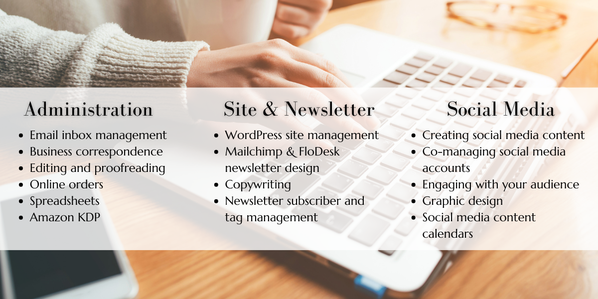 Not only am I a published novelist, but I’m also a virtual assistant! Since early 2022, I have offered administrative and social media assistance to creatives, small business owners, and nonprofit ministries.